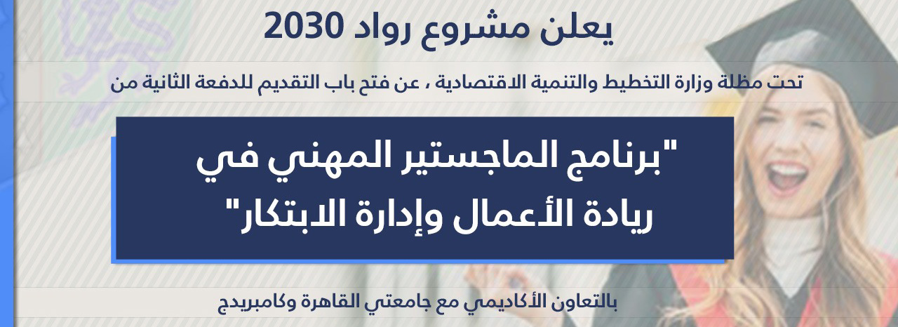 The Ministry of Planning and Economic Development, represented by the Rowad 2030 (Entrepreneurs 2030) Project, announced the opening of applications for the second batch of the "Professional Master's Program in Entrepreneurship and Innovation Management" in academic cooperation with Cairo and Cambridge Universities.